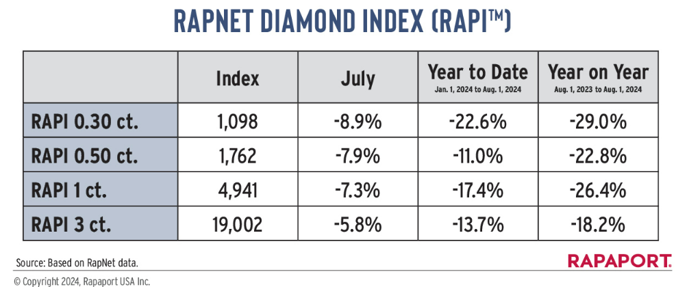 The RapNet Diamond Index (RAPI™) for one-carat diamonds, referring to round diamonds from D to H color and IF to VS2 clarity, dropped by 7.3% in July, marking the most significant monthly decline for this size category since December 2008. Diamonds of 0.30 and 0.50 carats also saw respective declines of 8.9% and 7.9%, while prices for 3-carat stones decreased by 5.8%. Despite a more moderate decline of 3.2% for round diamonds of one carat, D to H color, SI clarity, the market generally showed signs of weakness, with an increase in polished diamond inventory and a reduction in production by Indian manufacturers to realign supply with the current level of demand.