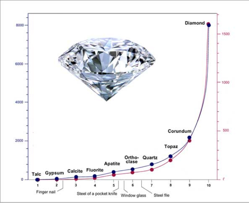 The Mohs scale indicates the hardness of the stone through essentially empirical measurements using as a reference the hardness of ten minerals numbered progressively from 1 to 10, the first mineral in the series is talc, the last one the diamond.