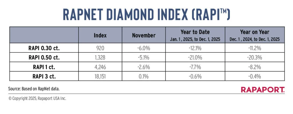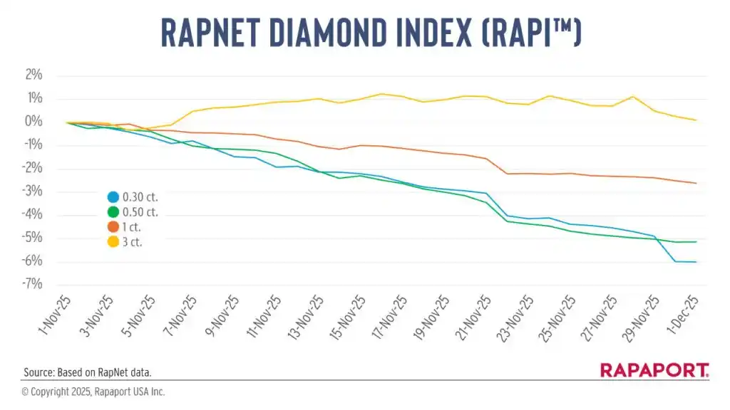Selon Rapaport, le RapNet Diamond Index (RAPI™) pour les diamants ronds de 1 carat (D–H, IF–VS2) a reculé de 2,6 %. Les catégories inférieures ont enregistré des baisses plus prononcées : –6 % pour les 0,30 carat et –5,1 % pour les 0,50 carat. À l’inverse, les pierres de 3 carats ont affiché une légère hausse de 0,1 %, confirmant la divergence structurelle nette du marché.