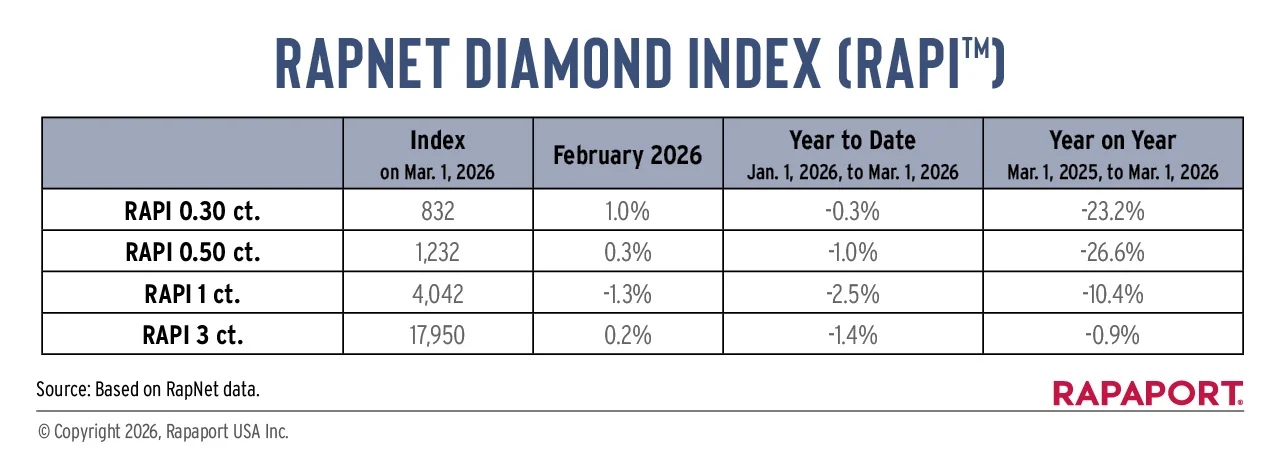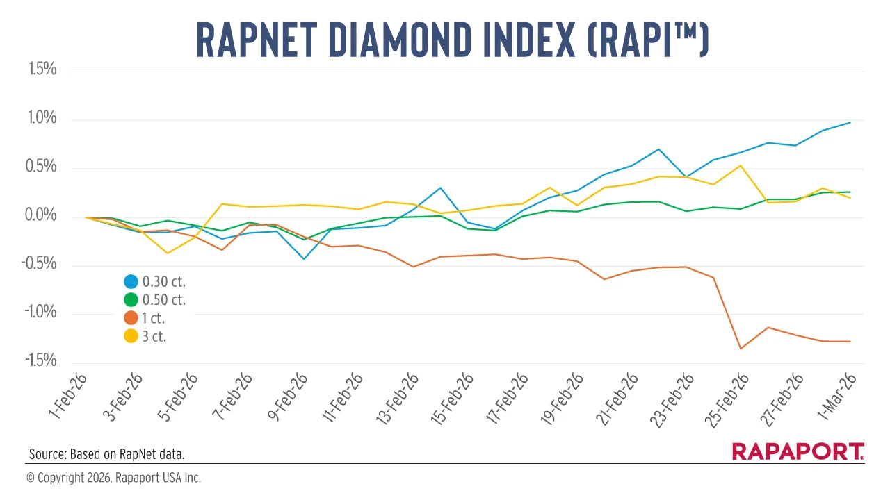 Secondo il RapNet Diamond Index (RAPI™), uno dei principali indicatori internazionali, i prezzi dei diamanti da 1 carato sono diminuiti dell’1,3% nel mese di febbraio.