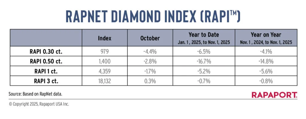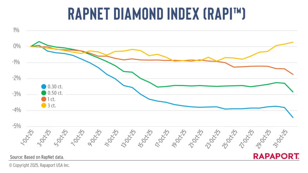 Según los datos de Rapaport, el RapNet Diamond Index (RAPI™) para diamantes redondos de 1 quilate (color D–H, pureza IF–VS2) descendió un 1,7%, una caída más moderada en comparación con los meses anteriores. Las categorías más pequeñas registraron pérdidas más pronunciadas: –4,4% para diamantes de 0,30 quilates y –2,8% para los de 0,50 quilates.