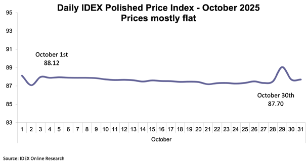 También el IDEX Polished Price Index mostró una ligera caída, del –0,48%, señal de un mercado en fase de consolidación tras la volatilidad estival vinculada a los aranceles recíprocos entre Estados Unidos e India. Los movimientos diarios fueron contenidos, con solo dos breves oscilaciones en los primeros y en los últimos días del mes.