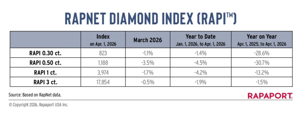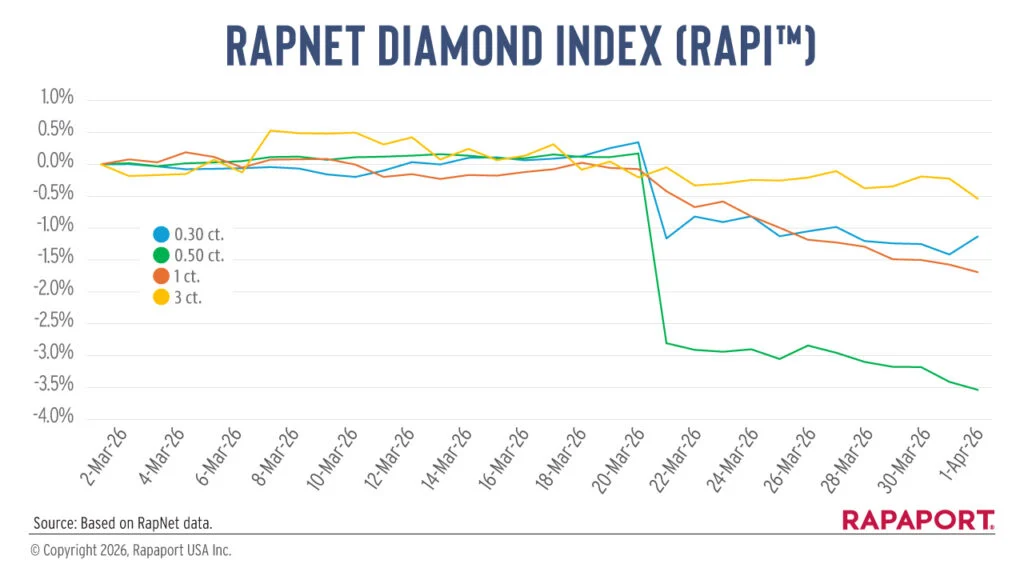 Volgens de RapNet Diamond Index (RAPI™) daalden ronde diamanten van 1 karaat (D–H, IF–VS2) met 1,7%. Ook kleinere stenen lieten een duidelijkere zwakte zien: diamanten van 0,30 karaat daalden met 1,1%, terwijl die van 0,50 karaat een terugval van 3,5% kenden. De daling bij diamanten van 3 karaat bleef beperkter en bedroeg 0,5%.